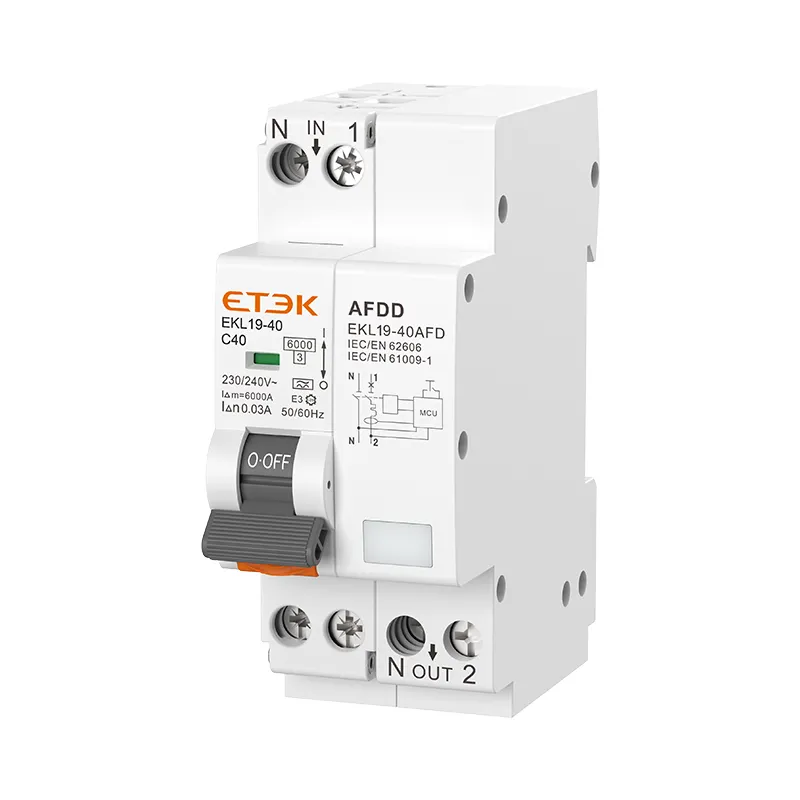 EKL19-40AFD é 1P+N(Polo N pode ser dispositivos de detecção de falha de arco ON/Off com RCBO integrado em capacidade de interrupção de 6kA, com corrente nominal de até 40A e sensibilidade de 300mA. Indicação de falha de arco LED (Durante o modo de operação padrão (alternância na posição ON), o LED fica verde. Quando a alternância está na posição OFF ou quando ocorre uma falha, o LED fica VERMELHO), botão de teste cinza para verificar o funcionamento correto do dispositivo de corrente residual. Com apenas 36 mm de largura, eles fornecem proteção contra falhas de arco, curto-circuito de sobrecarga e correntes de falha de aterramento.