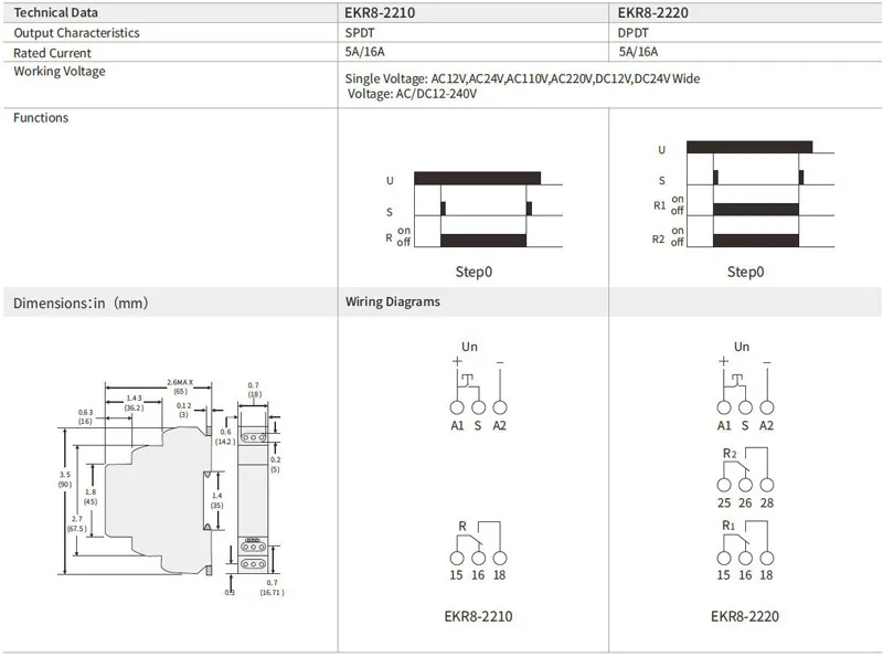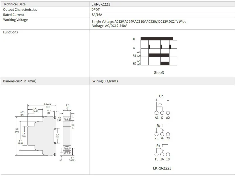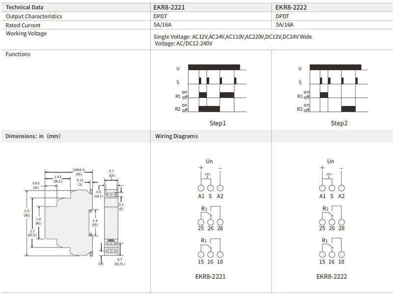 Relé de passo DPDT passo 2 12-240VAC/DC 16A |