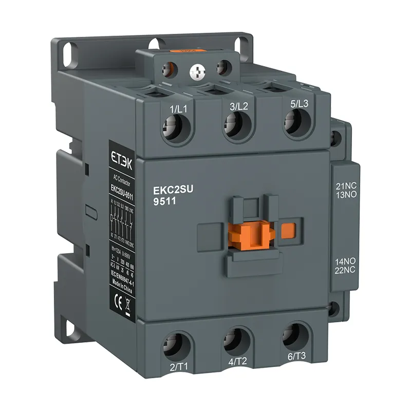 Os contatores CA da série EKC2SU são usados para controlar circuitos de motores trifásicos de até 690 V CA. Esses contatores são do tipo bloco com 3 polos principais. Construídos em contato auxiliar 1NO+1NC e supressão de surtos, resultando em economia de tempo e custo de instalação.