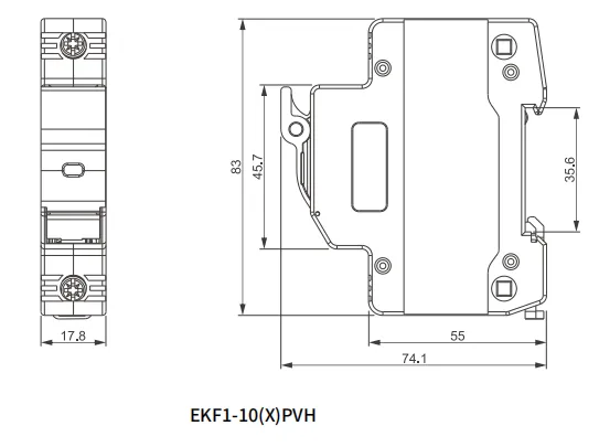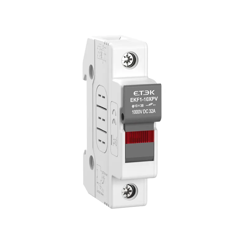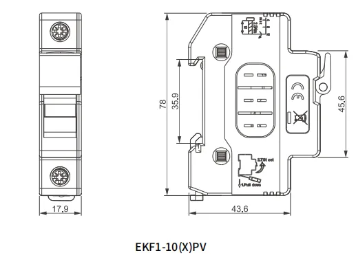 EKF1-10PV é um porta-fusível DC projetado para a proteção de strings fotovoltaicas contra curtos-circuitos e sobrecargas. Ele tem uma tensão de trabalho nominal de DC1000V e uma corrente máxima de trabalho de 32A. Ele é instalado com segurança usando trilho DIN padrão de 35 mm para compatibilidade e estabilidade ideais.