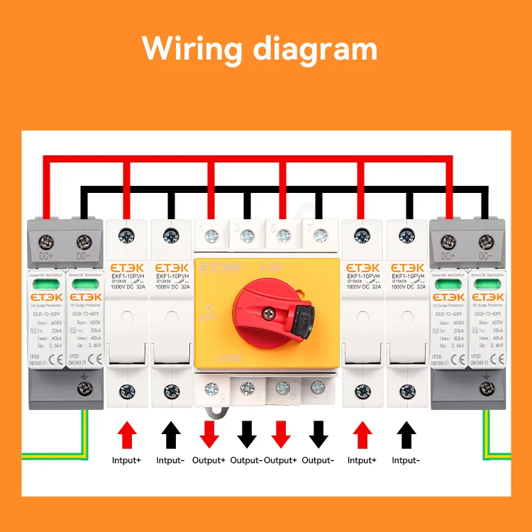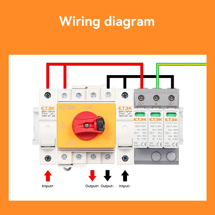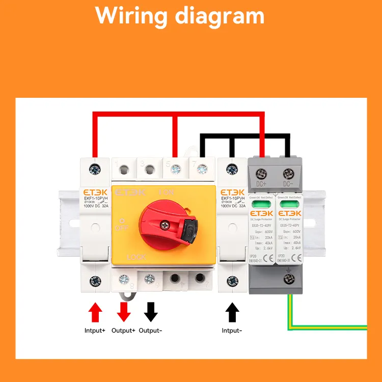 | EKD6-DB32-4T | DC Isolador 4P 32A 4série /1(2+2) strings Ligação superior PL60*45mm |
