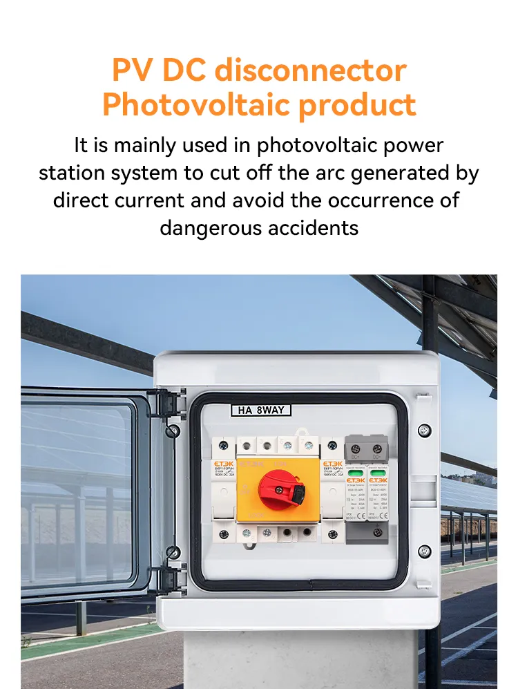 Um interruptor isolador DC é um dispositivo de segurança elétrica que se desconecta manualmente dos módulos em um sistema solar PV. Em aplicações PV, interruptores isoladores DC são usados para desconectar manualmente os painéis solares para fins de manutenção, instalação ou reparo.