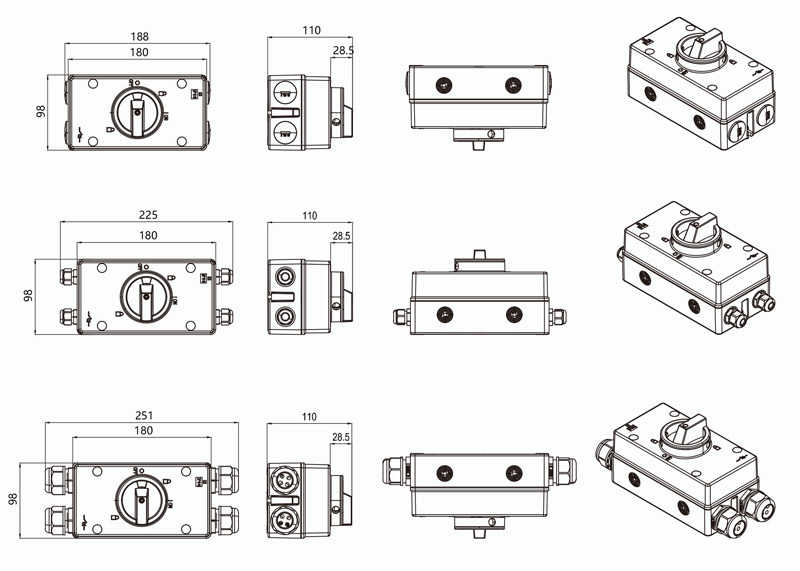 | EKD6-EL32R-4S | Isolador DC com caixa IP65 4P 32A 4série /1(3+1) string Topo para a ligação inferior |
