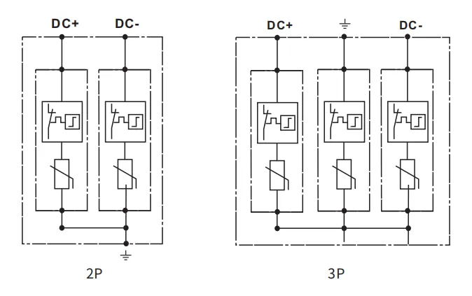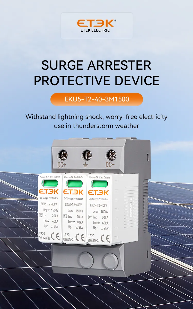 EKU5-T2-40 PV SPD é um protetor contra surtos DC especialmente projetado para sistemas de fornecimento de energia fotovoltaica. A tensão operacional contínua máxima atinge DC1500V. Essas unidades devem ser instaladas em paralelo nas redes DC para serem protegidas e fornecer proteção de modos comuns e diferentes. Seu local de instalação é recomendado em ambas as extremidades da linha de fornecimento de energia DC (lado do painel solar e lado do inversor/conversor), especialmente se o roteamento da linha for externo e longo.