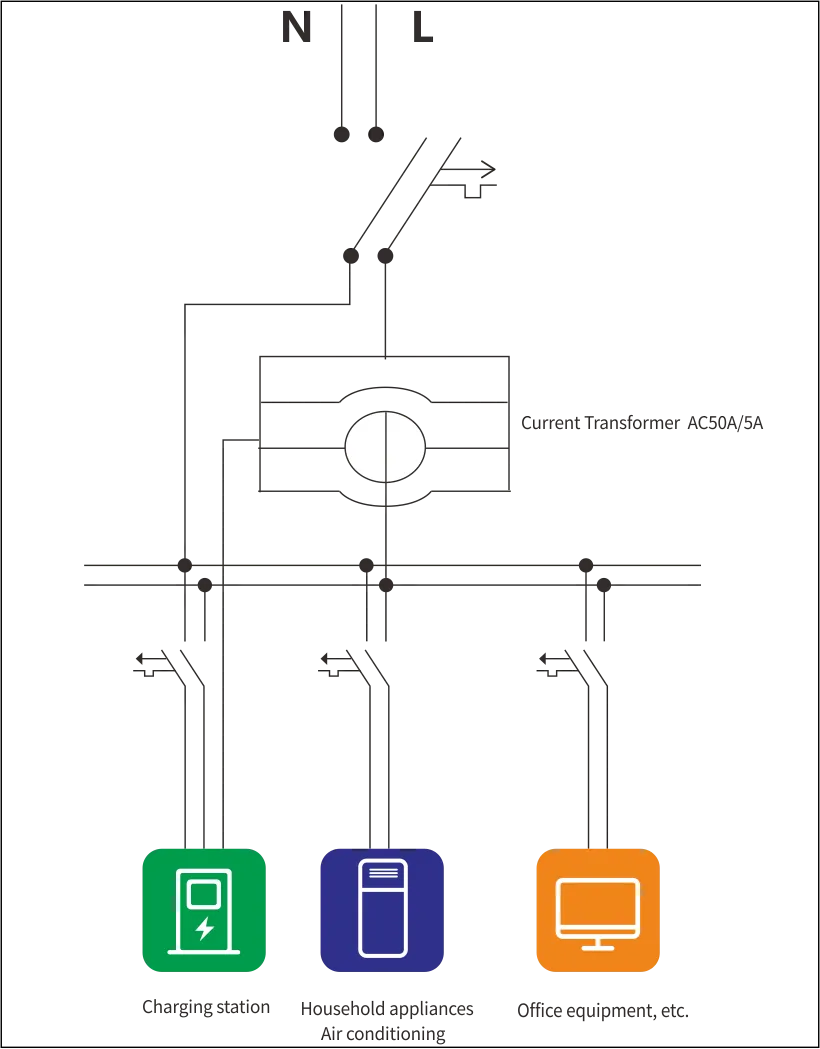 Enquanto a corrente de carga é incerta, o interruptor de ajuste de corrente da estação de carga se torna o interruptor de ajuste da taxa de transformação do transformador de corrente. A taxa de transformação do transformador de corrente externo é definida por software ou configuração de fábrica.