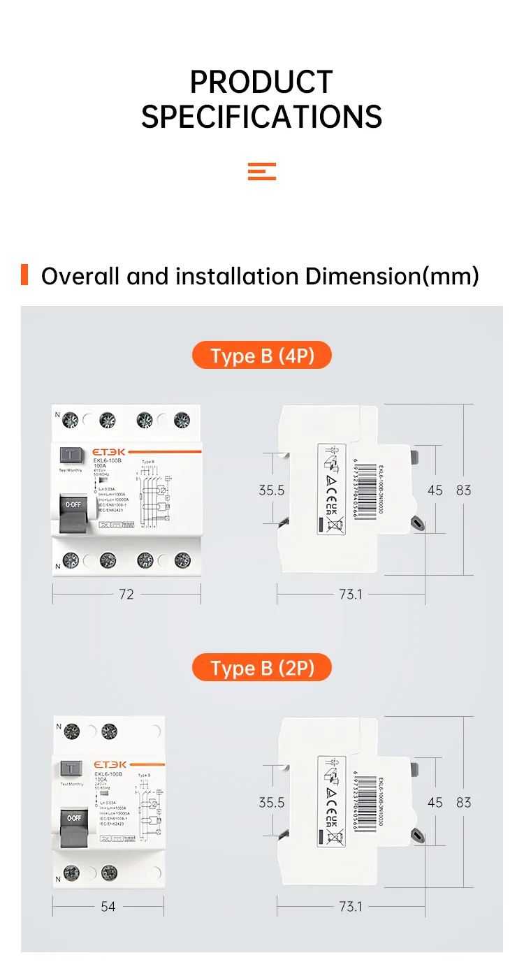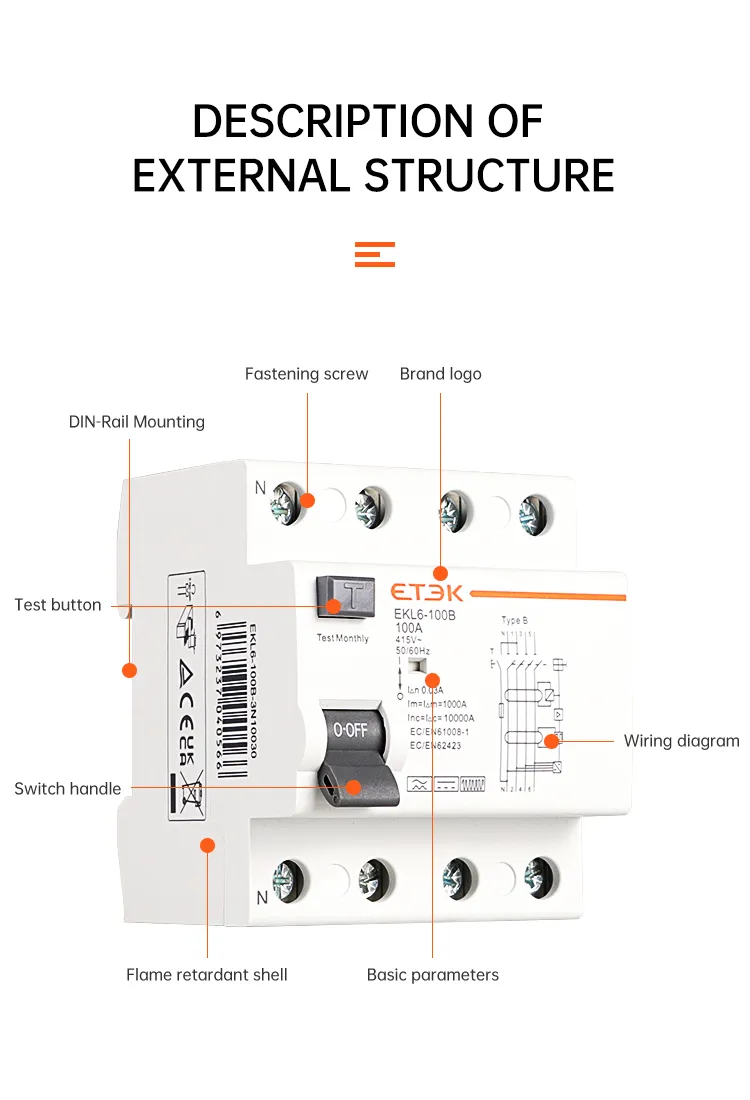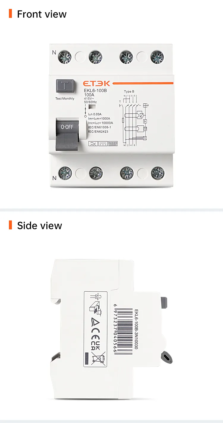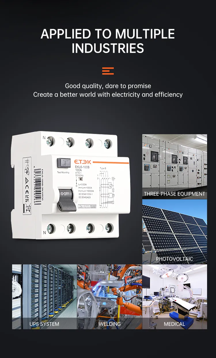 O RCD EKL6-100B Tipo B tem um design de aparência inovador, estrutura compacta, boa confiabilidade e alta segurança. Os produtos estão em conformidade com IEC61008-1, IEC62423. Eles garantem níveis de proteção mais altos com máxima continuidade operacional em todas as condições de trabalho. Os RCDs Tipo B podem garantir a máxima segurança em muitas aplicações, como Estação de Carregamento de VE, Guindaste e Elevador, usinas de energia fotovoltaica e eólica, etc.
