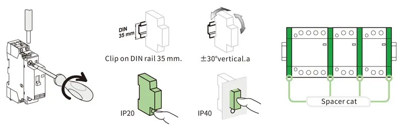 | Observação: No caso de montagem do contator em um gabinete cuja temperatura interna esteja na faixa entre 50℃ e 60℃, é necessário usar um espaçador entre cada contator. | ||