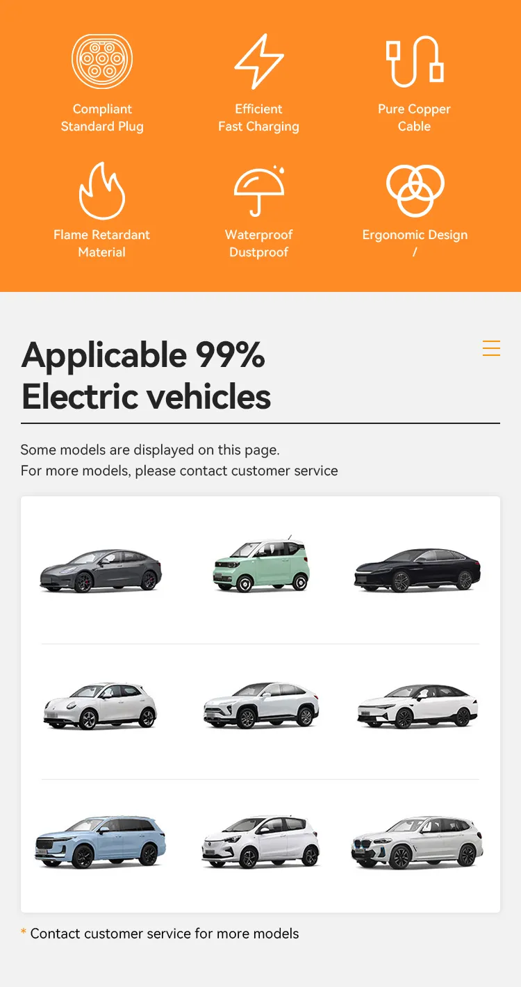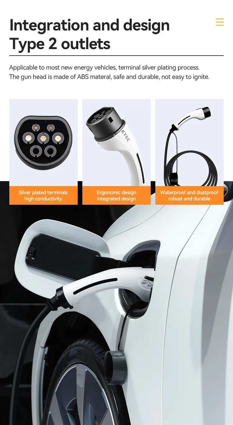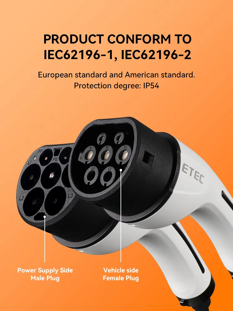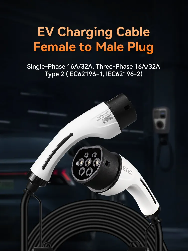 Cabos de carregamento CA tipo 2 versão de plugue duplo (Tipo 2 para Tipo 2 ou Cabo de extensão fêmea para macho), que é usado para a conexão da extremidade da estação de carregamento até a extremidade do veículo elétrico. O produto atende aos padrões de conector de carregamento IEC 62196-2. São principalmente duas opções de corrente de 16A e 32A, que são divididas em versão monofásica e trifásica e têm como padrão um cabo reto preto de 5m.