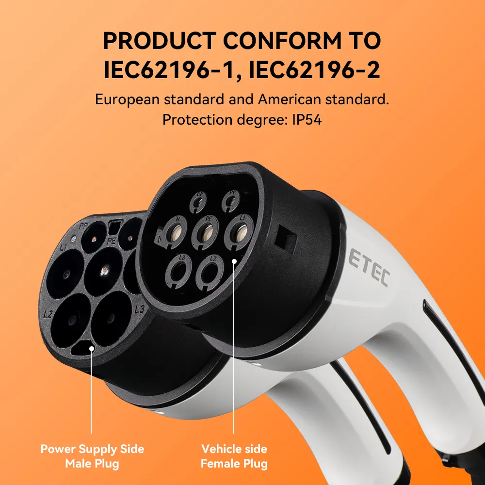 Cabos de carregamento CA tipo 2 versão de plugue duplo (Tipo 2 para Tipo 2 ou Cabo de extensão fêmea para macho), que é usado para a conexão da extremidade da estação de carregamento até a extremidade do veículo elétrico. O produto atende aos padrões de conector de carregamento IEC 62196-2. São principalmente duas opções de corrente de 16A e 32A, que são divididas em versão monofásica e trifásica e têm como padrão um cabo reto preto de 5m.