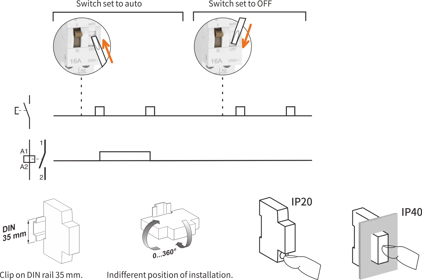 O fechamento do(s) polo(s) do relé de impulso é acionado por um impulso na bobina.