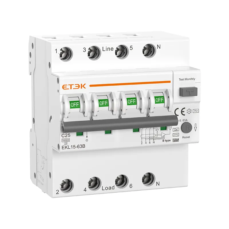 O RCBO tipo B EKL15-63B é um dispositivo avançado de proteção de circuito que combina as funções de um dispositivo de corrente residual (RCD) e um disjuntor miniatura (MCB). Este dispositivo híbrido é projetado para proteger circuitos de sobrecorrentes (como curtos-circuitos e sobrecargas de circuito) e correntes residuais (comumente conhecidas como correntes de fuga). A classificação "tipo B" refere-se às características de proteção de corrente residual, projetadas especificamente para lidar com formas de onda complexas não senoidais. Ele está em conformidade com os padrões IEC61009-1 e IEC62423.