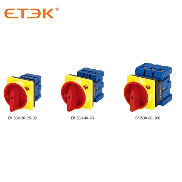 ● Os interruptores rotativos da série EKIS30 têm 7 classificações de corrente: 20 A, 25 A, 32 A, 40 A, 63 A, 80 A e 100 A.