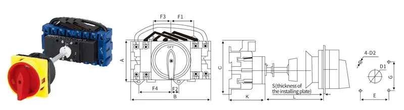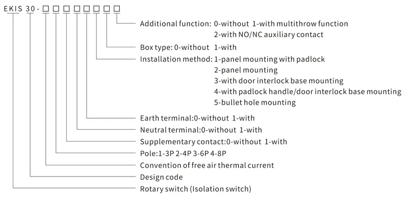 ● Os interruptores rotativos da série EKIS30 têm 7 classificações de corrente: 20 A, 25 A, 32 A, 40 A, 63 A, 80 A e 100 A.