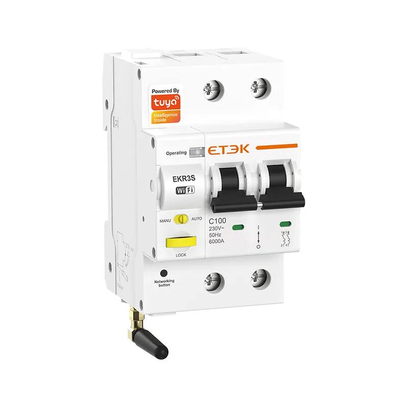 O disjuntor inteligente EKR3S é um dispositivo revolucionário que utiliza tecnologia eletrônica para regular disjuntores tradicionais. Ele é capaz de monitorar em tempo real as informações de status do equipamento, incluindo tensão, corrente, temperatura, consumo de energia e vários estados de falha, como sobretensão, subtensão, sobrecarga e superaquecimento. Essas informações podem ser relatadas ao cliente, e o limite de proteção pode ser definido pelo usuário. Este produto é um dispositivo de equipamento integrado independente que permite aos usuários visualizar informações do dispositivo e definir parâmetros relacionados de maneira amigável. Uma vez conectado à Internet, o Tuya APP pode exibir informações do produto, controle remoto, temporização e outros recursos.