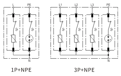 O módulo N-PE e o módulo LN fazem uma distinção mecânica fornecida para evitar combinações incorretas de módulos SPD plug-in e soquetes em conformidade com as disposições relevantes de 7.3.1 no padrão IEC61643-11. Por exemplo, o cartucho do modo N-PE (consiste em tubo de descarga de gás) pode ser conectado no modo LN (consiste em varistor), isso pode levar a situações perigosas, como surto de incêndio.