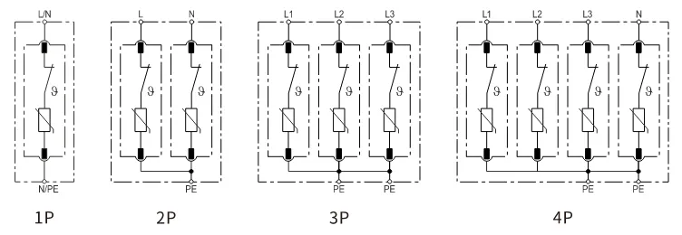 | Nº de postes | 1P | 2P | 3P | 4P | 1P+NPE | 3P+NPE |