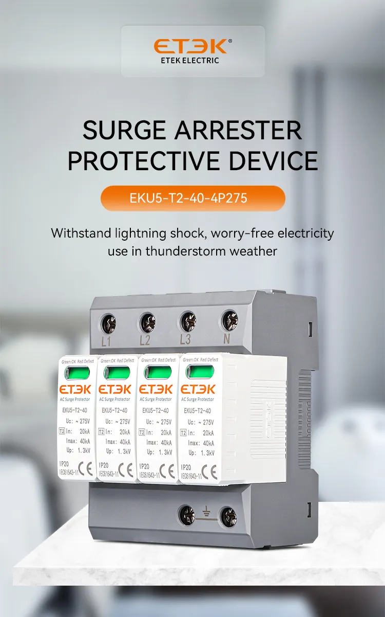 O Dispositivo de Proteção contra Surtos CA EKU5-T2-40 é um dispositivo de Classe II projetado para proteger contra sobretensão transitória de operações de comutação rápida ou descargas atmosféricas indiretas. Ele pode descarregar surtos de tensão induzidos (8/20 μs) e é adequado para uso como o segundo nível de proteção em painéis de distribuição de energia com protetores Tipo 1, ou como o primeiro nível de proteção para aplicações não diretamente expostas a descargas atmosféricas e sem um sistema externo de proteção contra raios.