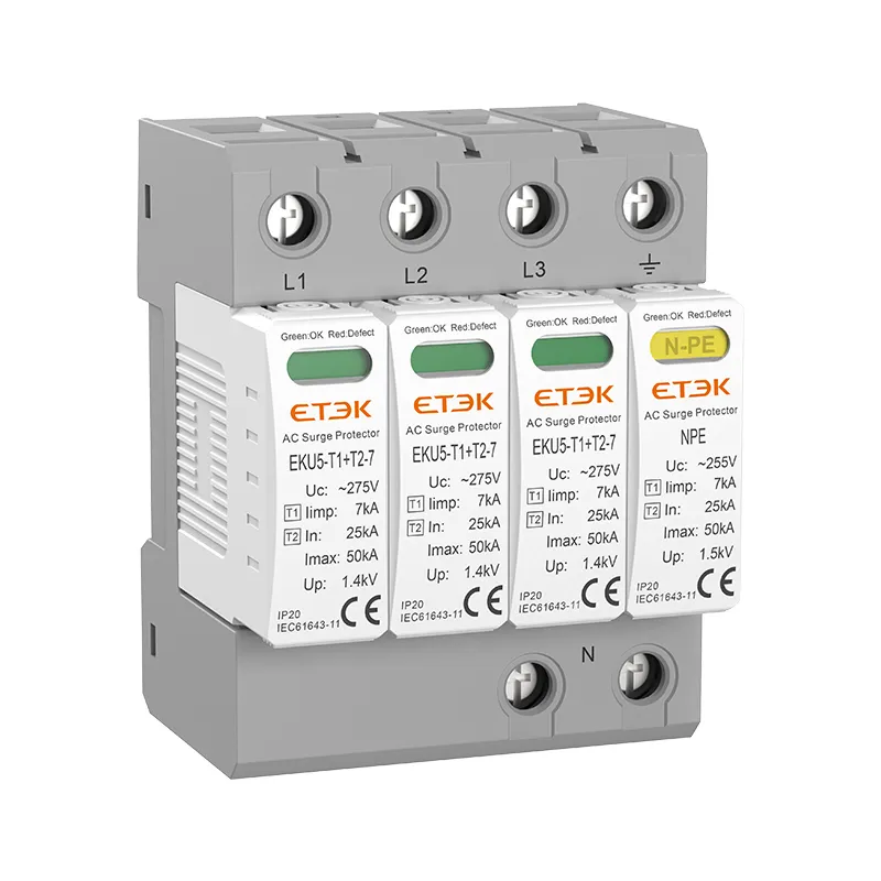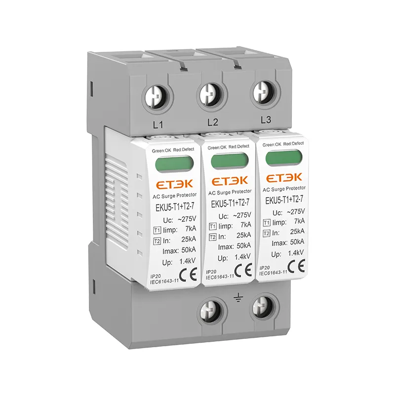 EKU5-T1+T2-7 é uma série de Dispositivos de Proteção contra Surtos CA Classe I+II Iimp 7kA projetados para proteger contra raios indiretos e diretos de baixa intensidade. Esses SPDs são equipados com Varistores de Óxido de Metal de alta energia, garantindo baixo tempo de resposta e características adequadas para proteção de Classe I e II. O design modular com inserções plug-in permite a substituição fácil e rápida de módulos de função caso o MOV atinja o fim de sua vida útil devido a alta intensidade ou picos frequentes de sobretensão.