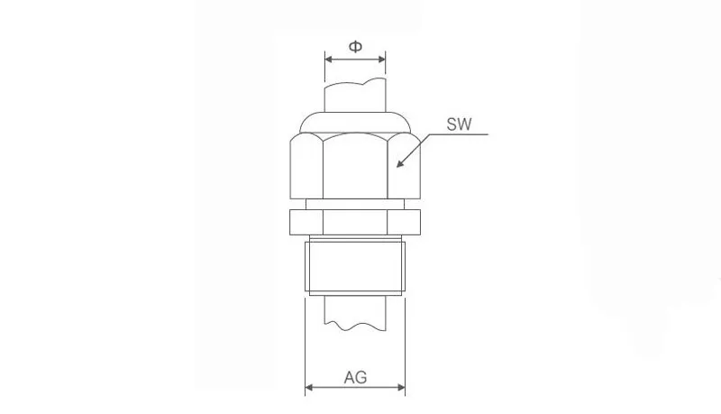 | Modelo | Tamanho do tópico (mm) | Tamanho do buraco AG (mm) | Comprimento do tópico (mm) | Espessura da parede (mm) | Cabo aplicável Ф(mm) | SW do tamanho da chave (mm) |